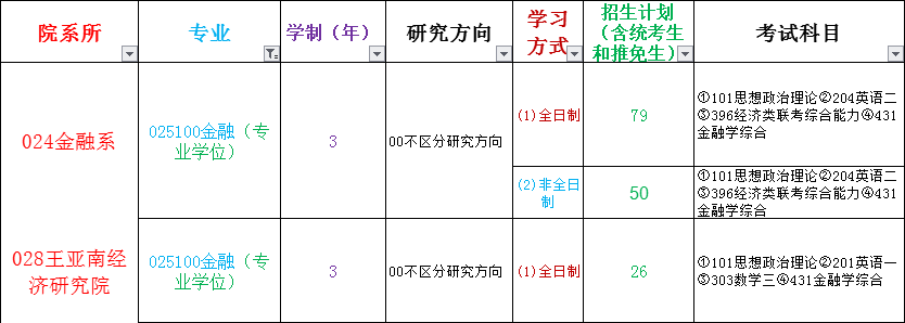 厦门大学的金融专硕,分布在经济学院的金融系和王亚南经济研究所院都有招收,而金融系有招收非全日制。根据最新的2020厦大考研招生目录来看,两个院系的全日制金融专硕的初试考试科目有所区别。ps :这边我们只讲解下全日制的